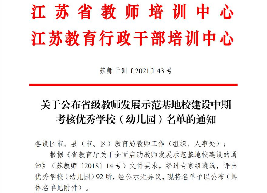 10月20日,江苏省教师培训中心、江苏教育行政干部培训中心公布省级教师发展示范基地校建设中期考核优秀学校(幼儿园)名单,92所单位获此殊荣,我校作为仅有的2所职业学校之一,荣列其中。
