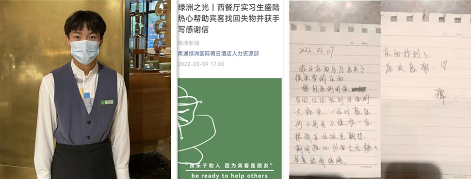 盛陆同学系我校19级国际商务(邮轮)专业学生,近期正在南通绿洲国际酒店实习。3月7日晚上,深航工作人员谭女士在绿洲国际酒店西餐厅用餐时,将私人物品放在西餐盘旁,后匆忙离去。由于物品放在用过的餐巾纸堆里,被当作垃圾清理了。等谭女士发觉物品丢失时,西餐厅已将垃圾扔入了酒店外的大垃圾桶内。谭女士沮丧万分,为自己的粗心懊恼不已。当晚在岗的盛陆同学发现了谭女士的异样,主动上前问清情况,并联系其他服务生,一同来到酒店外的垃圾区。看着桶里堆积的餐食垃圾,又看着身后焦急的谭女士,盛陆想也没想便开始翻找。期间,盛陆看到谭女士被夜风吹得瑟瑟发抖,还细心的帮她拿来了大衣外套。最终,帮谭女士找回了重要的私人物品。谭女士十分感激,向酒店提出了表扬。