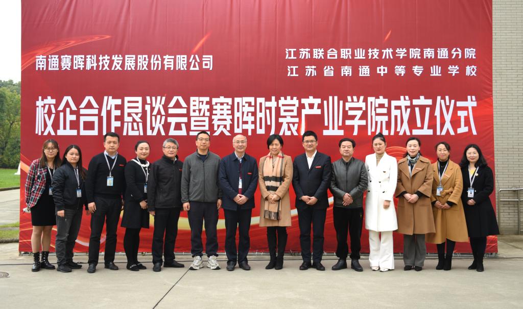 为加强产教深度融合,促进专业群建设,江苏联合职业技术学院南通分院于3月18日下午在服装实训楼204举行校企合作恳谈会暨赛晖时裳产业学院成立仪式。南通赛晖科技发展股份有限公司董事长姚桂兰、上海赛晖服饰有限公司总经理沈海生、上海星现文化传媒有限公司副总经理马渝雯,南通分院党委书记李明生、校长万军、副校长孙海如,南通分院财经商贸系主任曹琳、艺术设计系主任宋玖珣及师生代表出席本次活动。活动由南通分院科研处处长施捷主持。