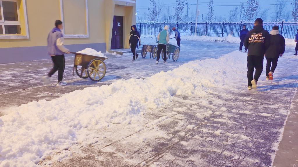 “老师们好!”“老师们早!”校园里孩子们穿着不太厚实的校服,一边扫雪一边和我们打招呼。虽然他们的普通话不是很标准,但是声音洪亮又真诚。小城干旱少雨,气候干燥。每逢遇到下雪,老师都会组织学生拿起打扫工具,将道路上的积雪堆到路边的花圃里,融化后灌溉草木。“这么少的衣服冷不冷?多穿点啊!”一位同事关心道,“不冷,新疆的小伙儿从不怕冷!”同学们一边干活一边风趣地回答,嘴里还呼着白气。