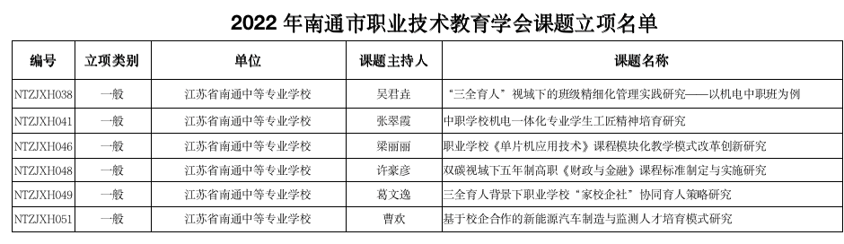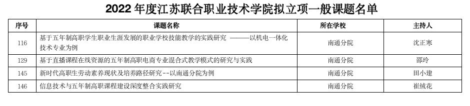 新闻资讯 当前位置: 首页 > 新闻资讯 > 学校要闻 > 正文 我校十余项江苏联院课题、南通市职教学会课题开题、结题 浏览量:时间:2022-11-04 近日,我校4项2022年度江苏联院课题和6项南通市职业技术教育学会课题成功立项。 4项江苏联院课题是: 6项南通市职业技术教育学会课题是: 近期我校科研课题立项喜报频传,科研建设硕果累累。我校将继续扎实推进教育科研,不断创造我校科研事业新高峰。 另外,在10月28日举行的江苏联院2021年课题结题评审活动中我校王强老师主持的课题《五年制高职机电专业现代学徒制培养模式实践研究——以上海蓝箭项目为例》经专家评审顺利结题。 (来源:科研处 文:朱梦忍 图:施捷 编辑:施建国 审核:吴晓进) 分享到: