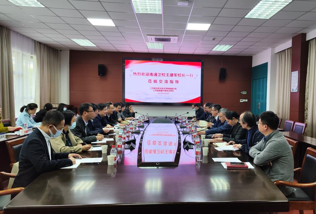 在两校座谈交流会上,王建军一行观看了学校宣传片。万军代表学校致辞,对南通卫校来校访问交流表示欢迎,介绍了我校接受省五年制高职人才培养工作水平评估的工作过程、做法和体会,表示两校作为同城兄弟学校,地缘相亲,类型相通,各层面交流合作比较频繁,结下了“亲戚”般的友谊,希望两校共同抢抓职业教育和区域经济快速发展的大好机遇,进一步加强交流互鉴、合作共进。吴晓进重点围绕迎评材料准备、专家现场考察过程中的关键点和注意事项进行了交流,教务处处长梅崇金、工会主席丛开源、学生工作处处长姚晓晶、招生就业与社会培训处处长张兵、信息工程系主任朱延庆分别从专业(群)剖析、校长报告撰写、校内实地考察、企业访谈、“三说”等方面作了介绍。