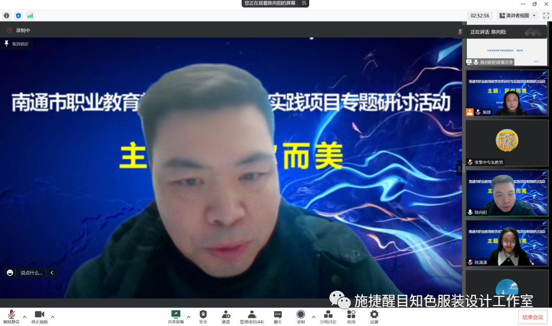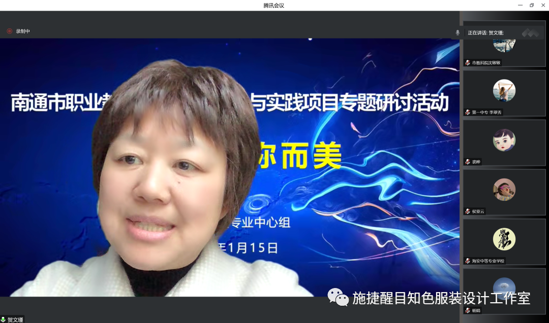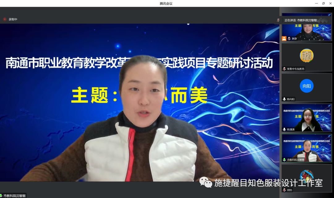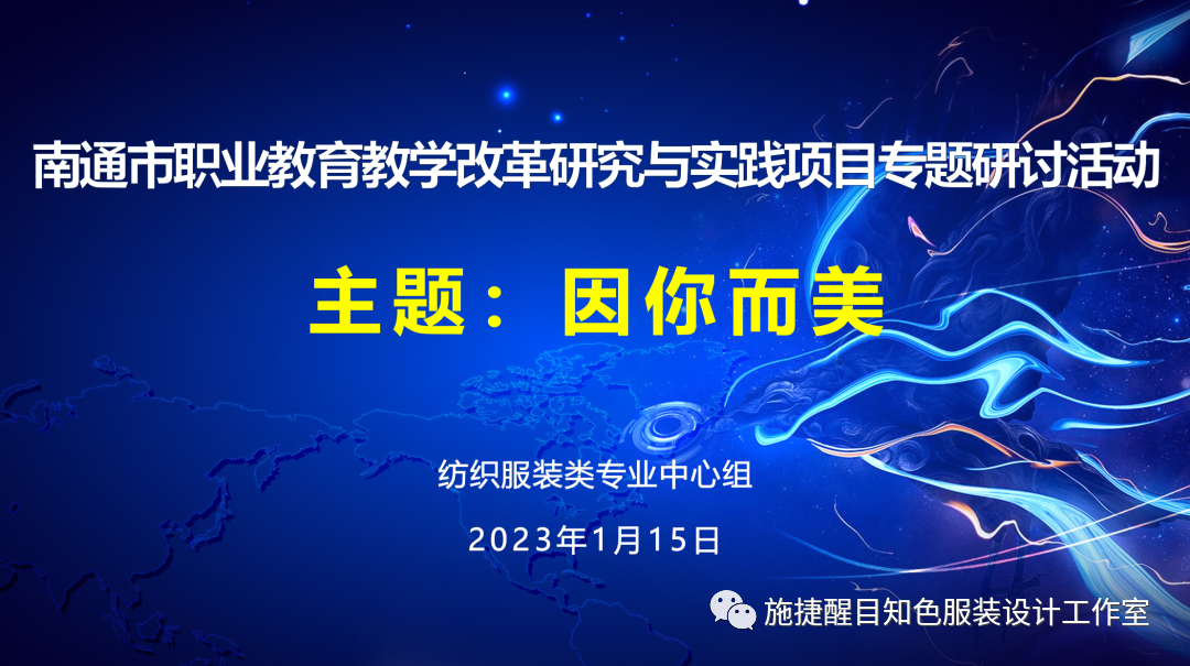 1月15日,南通市职业教育纺织服装类专业中心组开展“‘尚美立人’教学改革研究与实践项目之‘因你而美’主题研讨活动”。活动由南通市教科院和南通中专主办、江苏省施捷醒目知色服装设计工作室承办。活动特邀江苏理工学院贺文瑾博士、江苏教科院陈向阳博士以及南通市教科院沈敏敏教研员参会指导。南通中专副校长吴晓进致辞,施捷醒目知色服装设计工作室成员陈潇潇老师主持活动,活动分为四个环节。