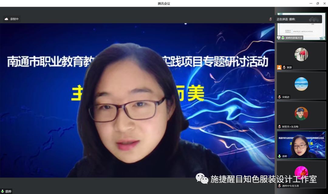 第一个环节是南通市职业教育教学改革研究与实践项目——《职业院校纺织服装类专业“尚美立人”教学主张的实践研究》项目组8位老师作主题分享。8位老师分别从服装设计、服装材料、服装图案等角度阐述各自专业教学中开展“尚美立人”教学主张实践应用及融合美育特色做法。其中,南通中专裘晔老师认为美育就是生活本身而不是生活的准备,并以“治愈系”童装设计为例,具体介绍在教学中“用美育去丰盈学生的认知底蕴”,促发学生发现生活美、理解生活美、体验生活美、创造生活美的创新思路和做法。