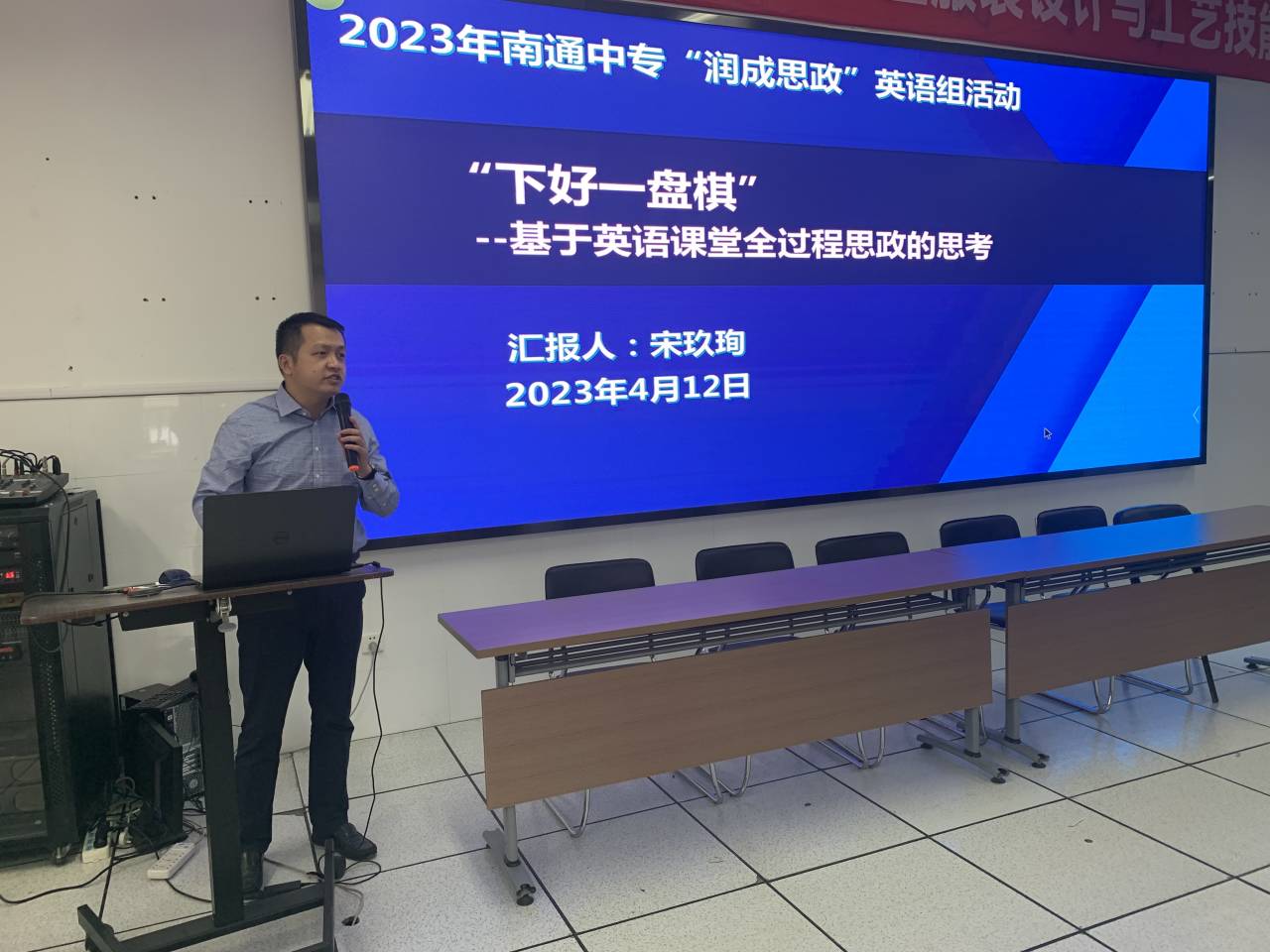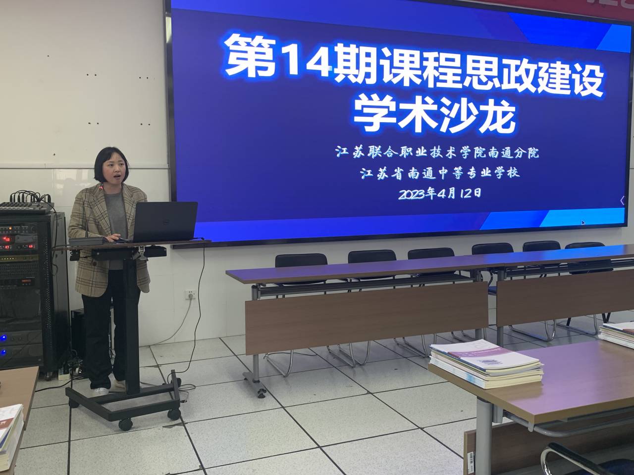 4月12日下午,我校第十四期课程思政学术沙龙在服装智慧实训中心204室举行。本次活动的主题为“探寻与守望本体”。学校课程思政教学研究中心全体成员,施强德艺轩名师工作室、姚海燕心艺班主任工作室、学校英语教研组全体人员参会。特邀南通卫生高职校教务处副处长周雯婷和我校艺术设计系主任宋玖珣给全体参与人员分别作了《冰上之上:英语课程思政教学策略的选择》和《下好一盘棋:基于英语课堂全过程思政的思考》的主题交流。活动由英语教研室主任施娟娟主持。