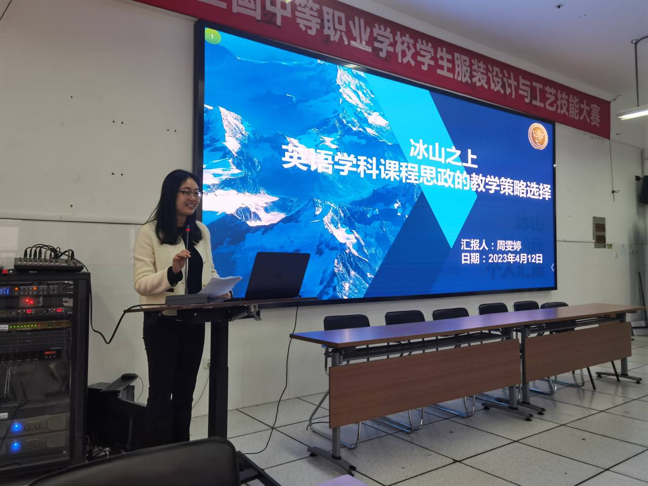 周雯婷老师结合去年参加国赛选拔赛的经历,对国赛方案中课程思政的具体要求,作了详细的解读;结合中职英语课程标准,围绕“冰山”这一意象,分别从冰山之上:英语学科课程思政的定位;冰山之下:英语学科课程思政元素、思政目标、思政信息技术;冰山一角:英语学科课程思政案例解析这三个方面进行了深入的阐述和剖析,将学生的英语核心素养和课程思政元素有机融合,介绍了BOPPPS和POA教学法,提出了“四好融通、双语并行、多元体验”的模块化设计思路。