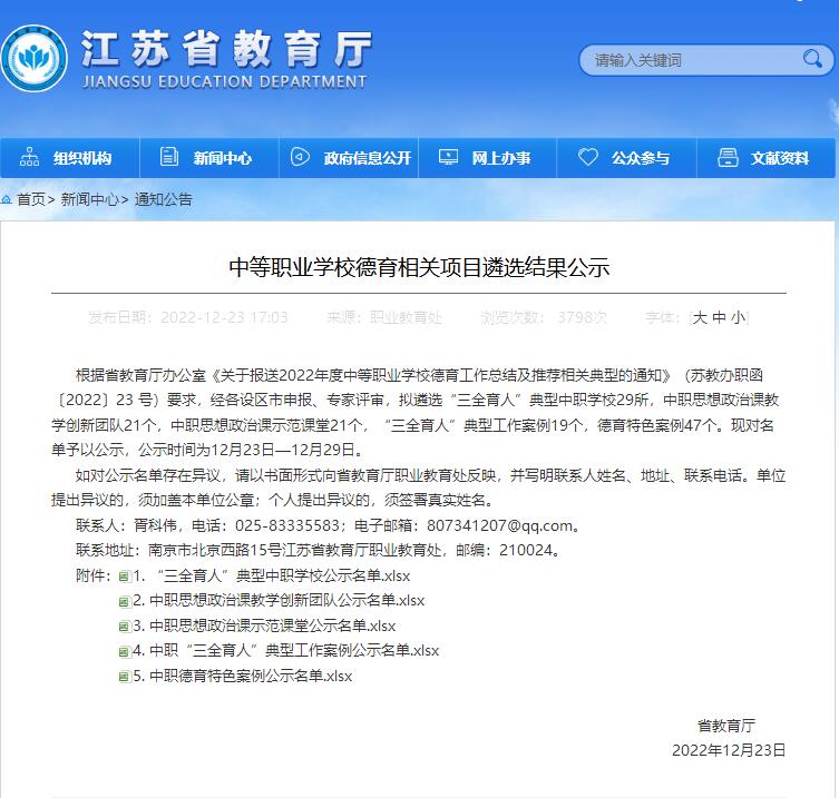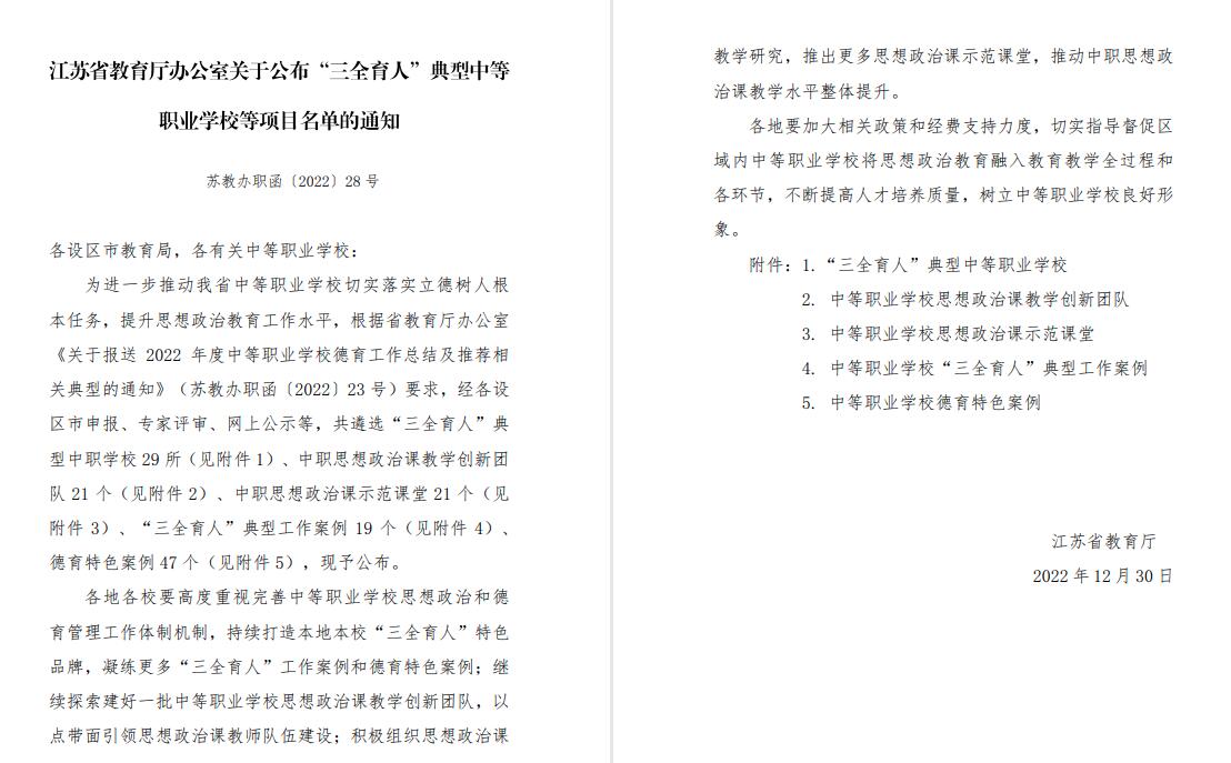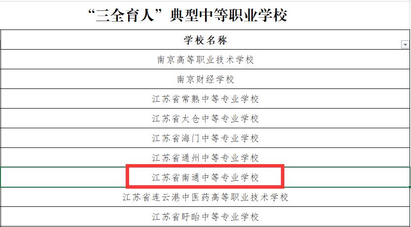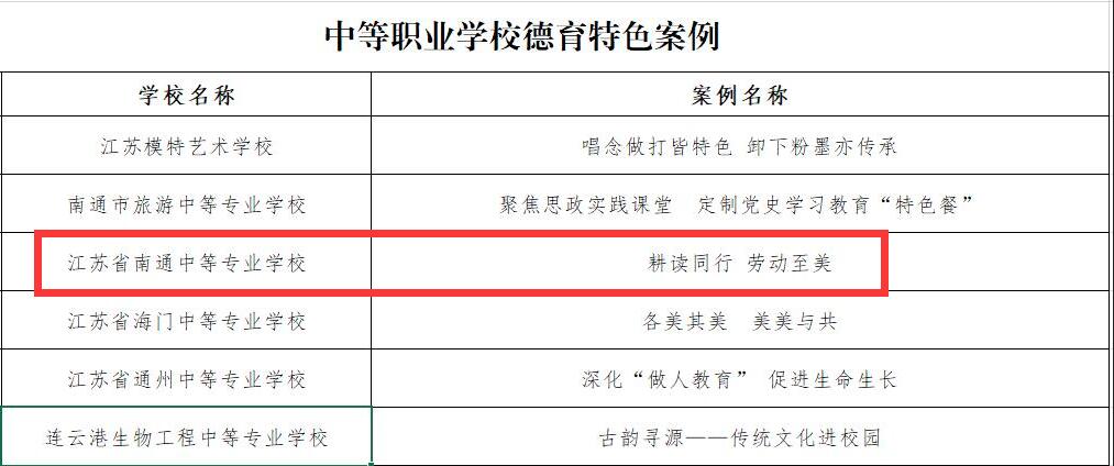 近日获悉,江苏省教育厅公布 “三全育人”典型中等职业学校等项目遴选结果,南通中专被评为“省‘三全育人’典型中职学校”,万军校长领衔的团队被评为“中等职业学校思想政治课教学创新团队”,《耕读同行 劳动至美》案例被评为“省中等职业学校德育特色案例”。