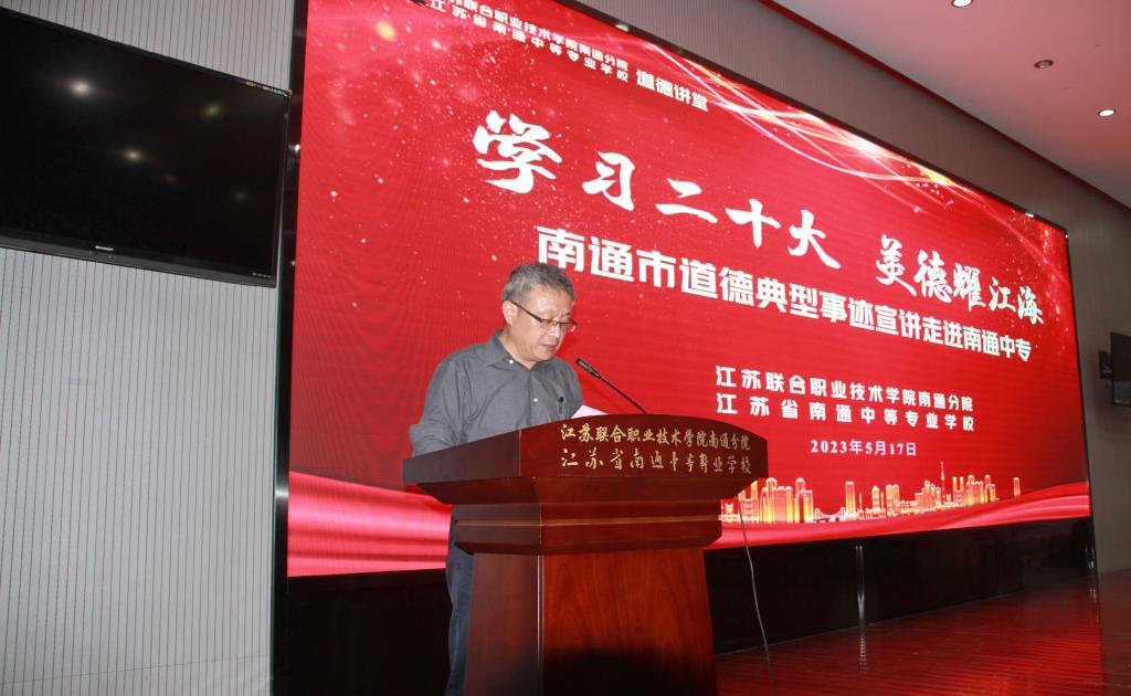 南通中专纪委书记、副校长吴晓进在主持宣讲活动时说,近年来,我市精神文明之花结出累累硕果,从“莫文隋”、江海志愿者到磨刀老人、“爱心邮路”,等等,涌现了一大批各类行业、各种类别的道德模范和精神文明典型。一个文明典型,就是一座精神丰碑;一群道德模范,正引领带动更多的人见贤思齐、向上向善。他号召全校师生学习道德典型的闪光事迹,感悟凡人善举的精神实质,知行统一,身体力行,争做崇高道德的践行者、文明风尚的维护者、美好生活的创造者,传递正能量,弘扬新风尚。