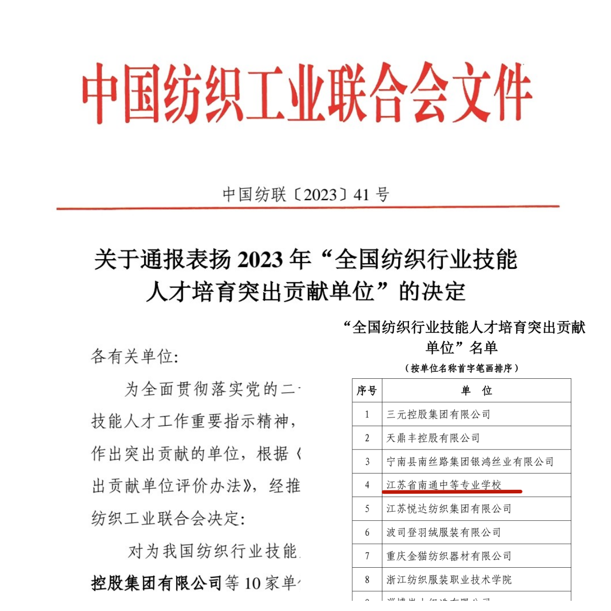 近日,中国纺织工业联合会发出通报表扬决定,表扬10家“2023年全国纺织行业技能人才培育突出贡献单位”,我校获此表扬,是受表扬单位中唯一中职院校。