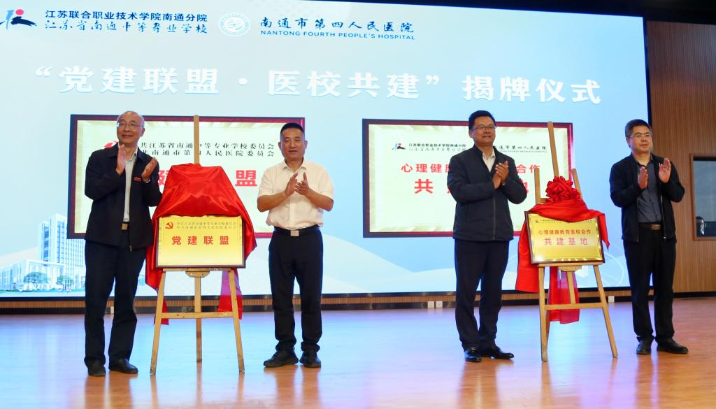 在领导与嘉宾的共同见证下,南通市第四人民医院副院长陈湘林和南通中专副校长华卜泉签订了医校合作共建协议。随后,双方领导为“党建联盟”和“心理健康教育医校合作共建基地”揭牌,并向“和悦心育”院方导师颁发聘书。