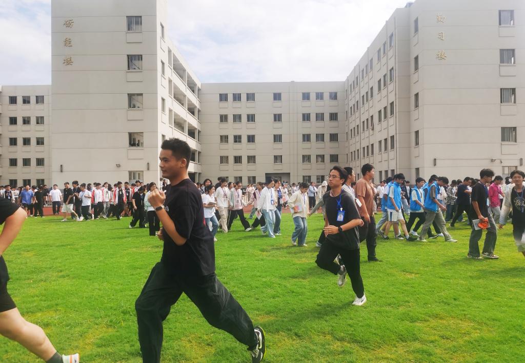 9月18日10时整,预先警报响起,演练正式进入实战阶段。学生在任课教师和班主任的引导下,按预定路线迅速、有序疏散:教学楼学生沿指定楼梯撤离,实训楼及创业园师生就近分流。疏散引导组人员在关键位置值守,指挥队伍保持秩序,真正做到“快而不乱”。至10时08分空袭警报响起时,全体师生已全部集结至大操场指定区域,班主任迅速清点人数,确保无一遗漏。