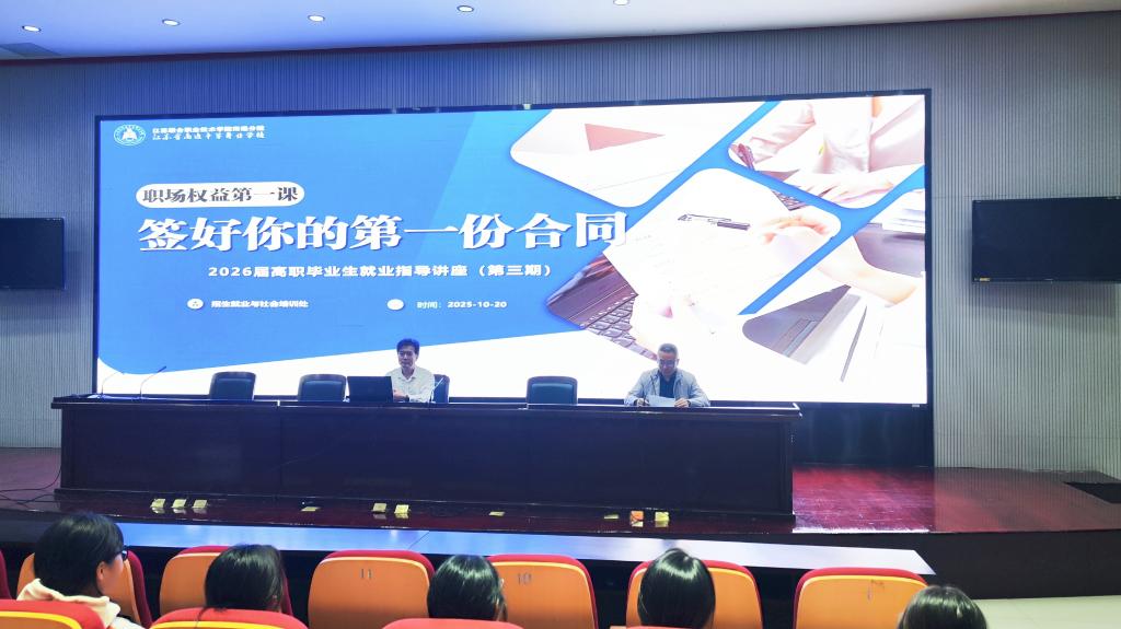 10月20日下午,江苏联院南通分院在学校弘德报告厅举办“签好你的第一份合同”——2026届高职毕业生第三期就业指导讲座。本次活动特邀南通市崇川区劳动人事仲裁院院长、崇川区侨联法顾委委员张晖担任主讲,为即将步入职场的学生带来一堂实用、权威的职前法律必修课。