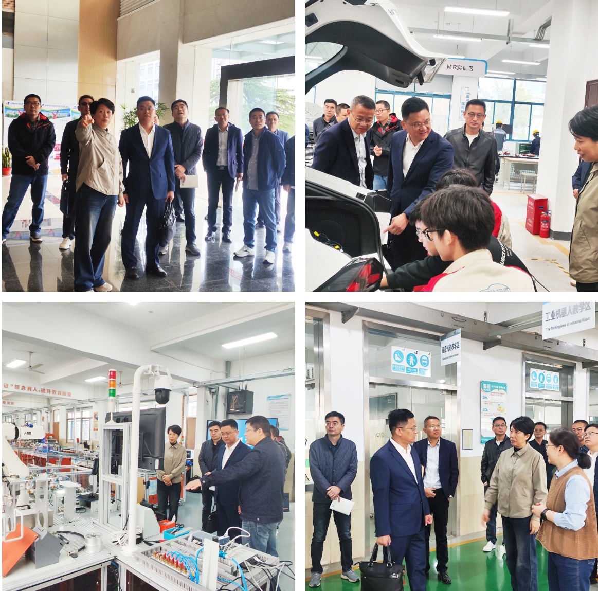 在常熟分院徐丽娟校长的陪同下,调研团队实地参观了汽车实训中心。中心内激光雷达、毫米波雷达等先进传感器设备整齐陈列,智能网联自动驾驶教学平台正模拟复杂路况进行环境感知实训,线控底盘装调实训车旁清晰标注着模块化拆装流程,学生实训井然有序。团队还参观了中英学徒实训中心、智能控制实训中心及智能制造实训中心,并与各中心负责人就实训教学、设备管理等进行了深入交流。