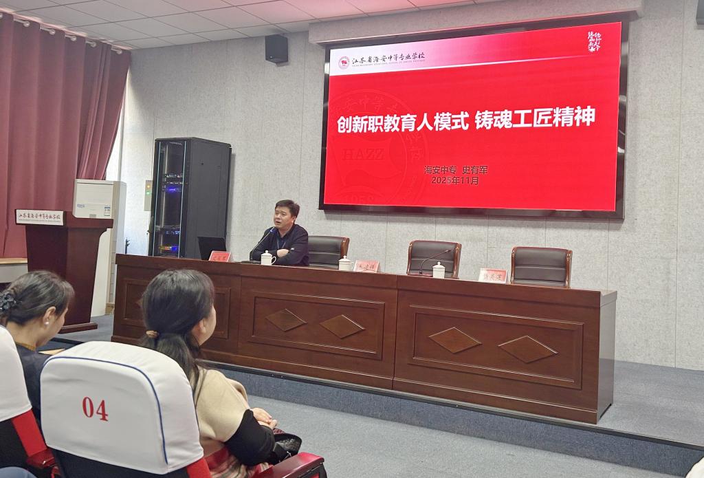 14日下午,培训班学员首先抵达海安中专,参观了法治安全馆与实训基地。法治安全馆通过图文展板、情景模拟与互动体验等多种形式,系统展示了法治普及、犯罪预防及未成年人权益保护等内容,呈现方式生动直观,富有教育意义。随后,海安中专史有军副校长为全体学员作了题为《创新职教育人模式 铸魂工匠精神》的专题讲座,深入分享了海安中专在育人模式创新与工匠精神培育方面的实践与思考。