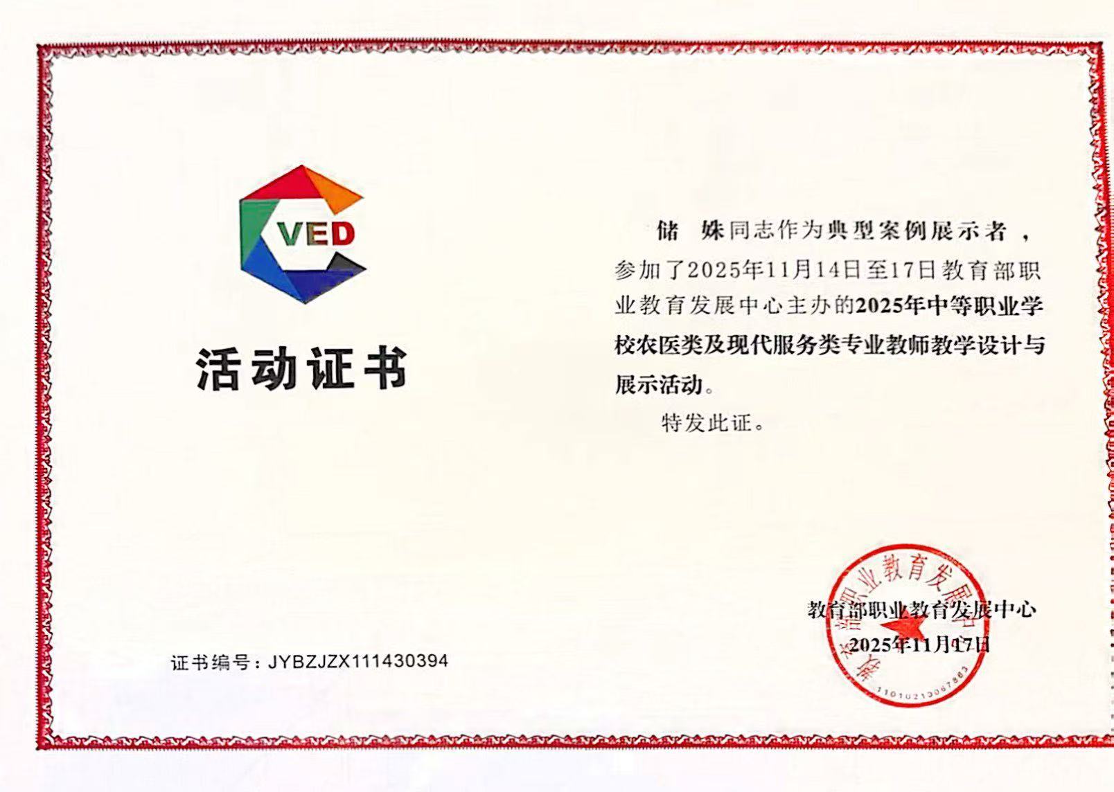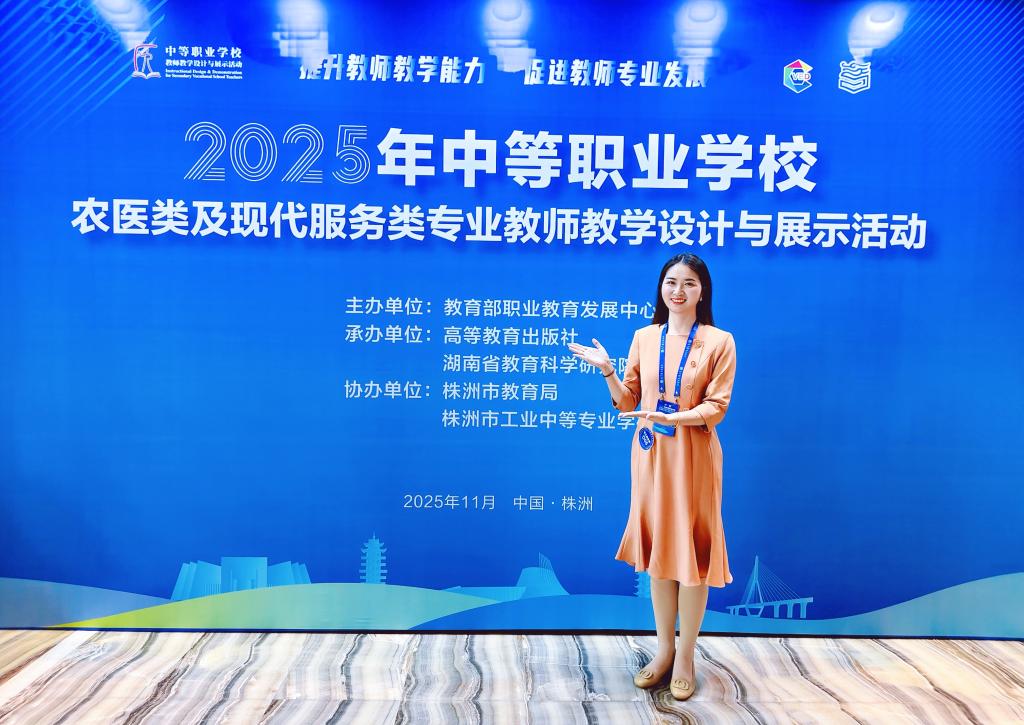 11月17日,由教育部职业教育发展中心主办、高等教育出版社等单位联合承办的2025年全国中等职业学校农医类及现代服务类专业教师教学设计与展示活动在湖南株洲落下帷幕。我校储姝老师凭借其扎实的教学功底和突出的创新能力,在激烈竞争中表现优异,荣获全国“典型案例展示者”(一等奖),其获奖作品将被高等教育出版社收录并面向全国推广。