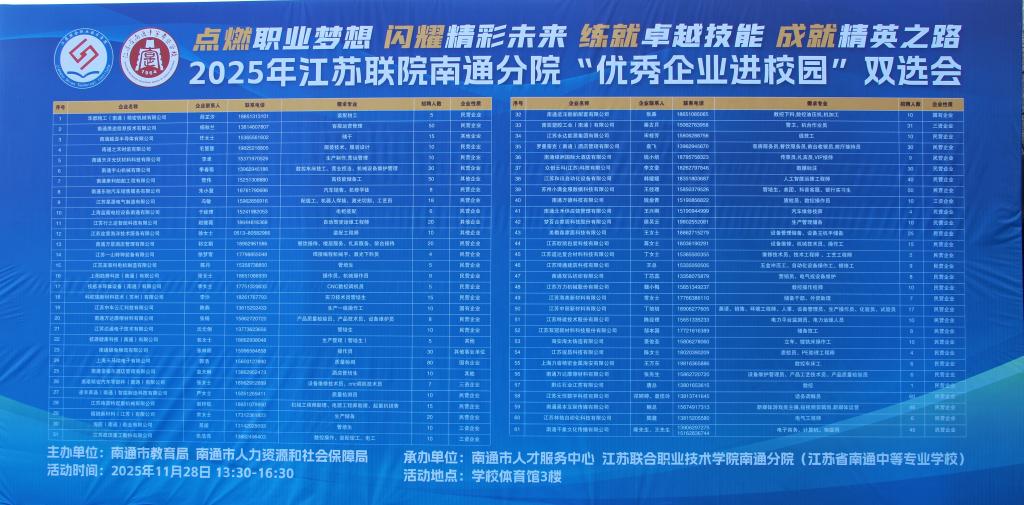 参会企业阵容强大、类型多元,江苏政田重工股份有限公司、南通远洋船舶配套有限公司、南通携途信息技术有限公司、梦百合家居科技股份有限公司等一批区域龙头企业与知名企业纷纷进驻,受到毕业生广泛关注。此外,华都精工、越亚半导体、美诺精密、凌丰家科等一批先进制造类企业也积极参与,进一步丰富了学生的择业选择。
