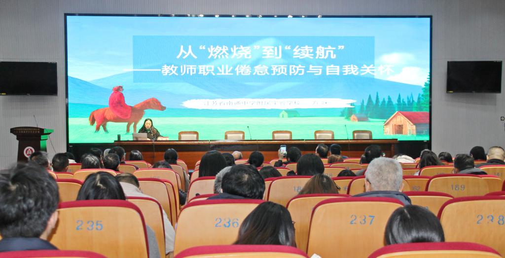 为深入贯彻立德树人根本任务,提升教师心理健康素养与职业幸福感,11月26日,我校积极响应南通市教育局“润心同行·赋能有术”教师心理健康教育专项工作部署,特邀南通中学附属实验学校心理教师、应用心理硕士方咪老师来校,为全体教职工作题为《从“燃烧”到“续航”——教师职业倦怠预防与自我关怀》的专题讲座。