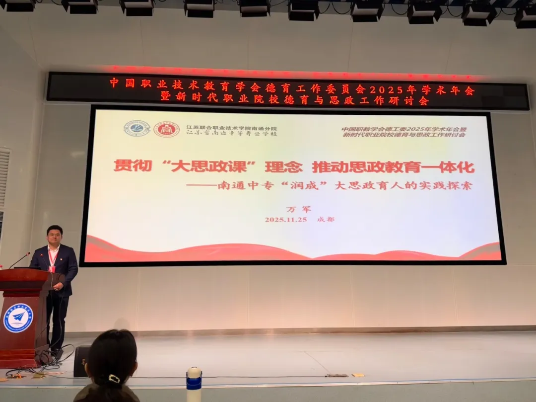 25日下午,大会同步开设两大平行会议。在平行会议(二)“思政课程及课程思政建设案例分享”环节,万军校长代表学校以《贯彻“大思政课”理念推动思政教育一体化——南通中专“润成”大思政育人的实践探索》为题,作了典型发言。该案例是江苏省唯一入选全国德育年会交流的典型案例,展现了我校在思政育人方面的创新成果与示范引领作用。