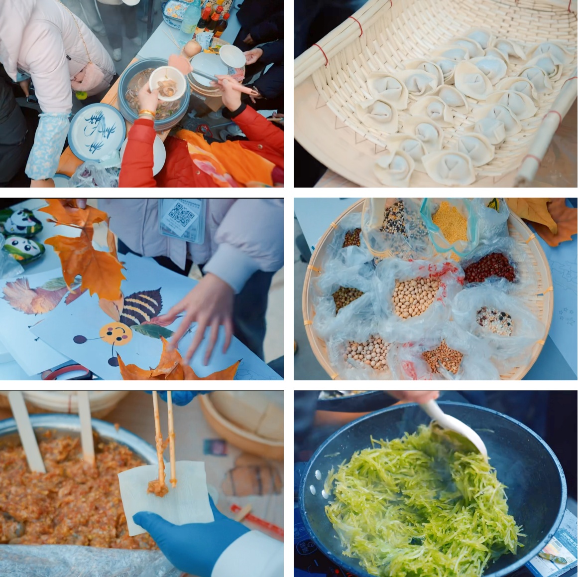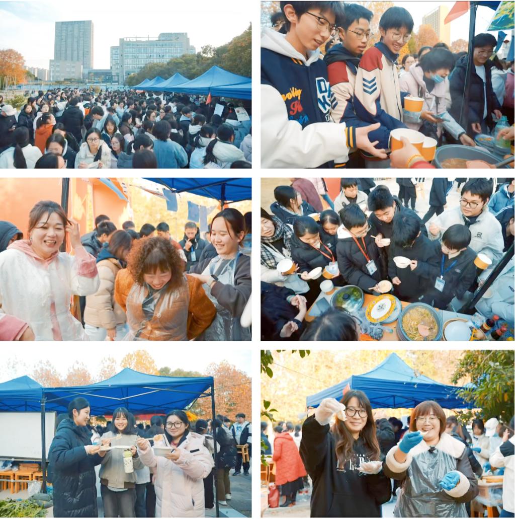 亲子菜肴加工体验更是欢声笑语、温情满满。家长与学生们分工协作,洗菜、切菜、烹饪有条不紊。有的系组队包水饺,雪白的面团在灵巧的手中变成圆润的饺子;有的系烹制扁豆菜饭,米饭的清香混合着蔬菜的鲜香令人垂涎;莴苣炒鸡蛋、木耳洋葱等家常菜也轮番登场,电磁炉上菜肴的香气弥漫整个“耕读园”。完成烹饪后,手持餐具等待品尝美味的学生把各系菜肴加工区围的水泄不通,温馨的互动场景成为丰收节里最动人的风景。