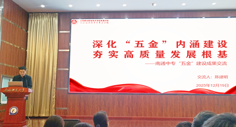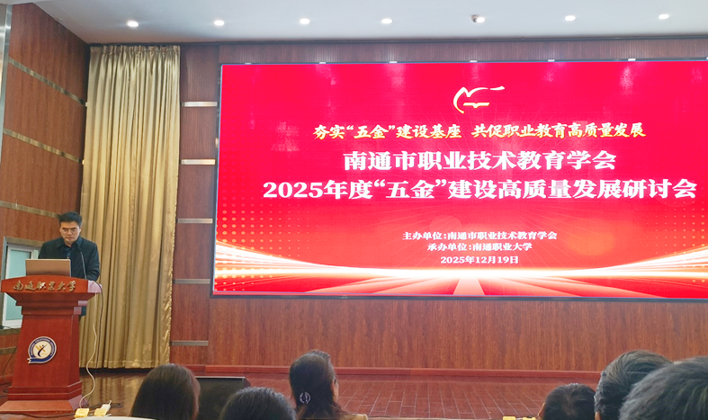 12月19日,南通市职业技术教育学会2025年“五金”建设高质量发展研讨会在南通职业大学举行。会上,我校副校长陈建明以《深化“五金”内涵建设 夯实高质量发展根基》为题,系统分享了我校在“金专、金师、金课、金教材、金地”建设方面的创新实践与典型经验,展现了学校服务区域发展、培育时代新人的使命与作为。