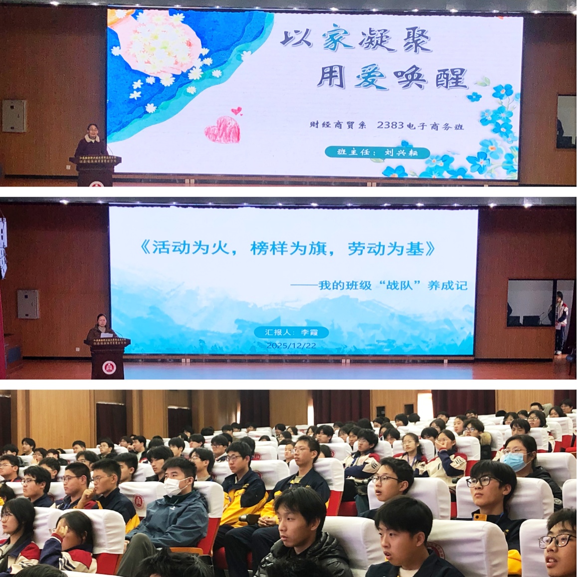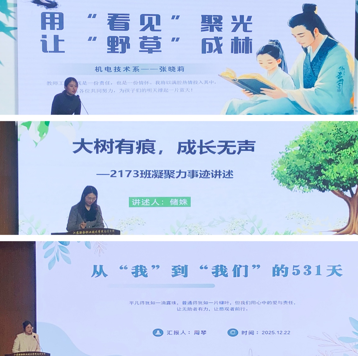 活动中,五位班主任代表依次发言。机电技术系张晓莉老师以《用“看见”聚光,让“野草”成林》为题,阐述了通过真诚关注激发学生潜能的做法;艺术设计系储姝老师围绕《大树有痕,成长无声》,介绍了借助“线上公众号+线下实践链”推动班级与专业融合的路径;机械工程系周琴老师以《从“我”到“我们”的531天》为主线,分享了通过共订班级公约、构建激励机制凝聚集体力量的历程;财经商贸系刘兴耘老师以《以“家”凝聚,用“爱”唤醒》为题,解读了构建班级“家文化”的实践;信息工程系李霞老师则从活动、榜样、劳动三个维度,讲述了班级在实践磨砺中逐步成长为“战队”的故事。