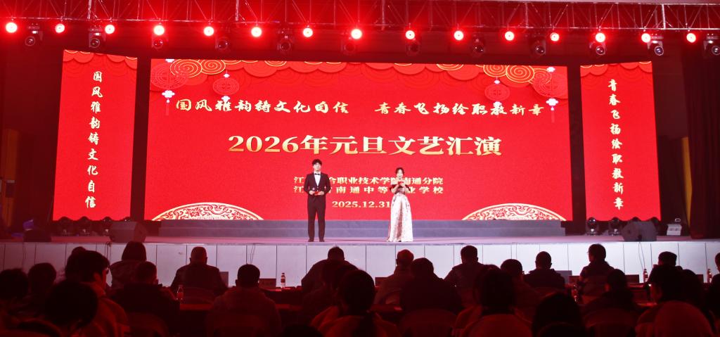 12月31日上午8时,江苏联合职业技术学院南通分院(南通中专)“国风雅韵铸文化自信,青春飞扬绘职教新章”2026年元旦文艺汇演在学校体育馆三楼火热举行。本次活动采用“现场观看+教室同步转播+网络实时直播”三维联动方式,全校师生共同参与,喜迎新年。