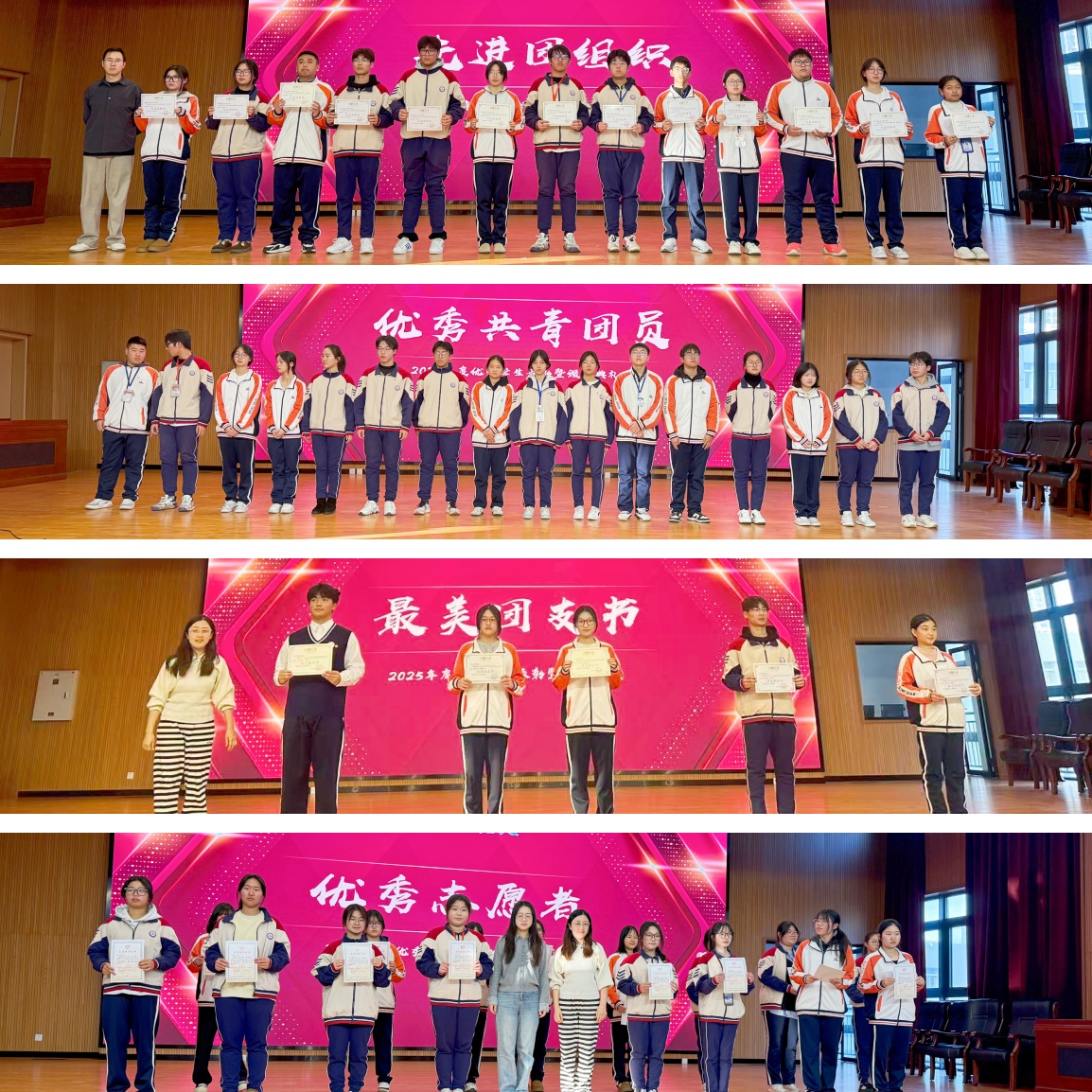 大会在庄严的《中国共产主义青年团团歌》中拉开序幕。会上,校团委委员依次为优秀共青团员、先进团组织、优秀志愿者、最美团支书及优秀学生会干部代表颁奖。获奖者中,有信念坚定、刻苦钻研的优秀团员,有凝聚力强、工作成效显著的先进团组织,有心怀大爱、甘于奉献的志愿者,有以身作则、服务同学的学生骨干,每一份荣誉背后都是辛勤付出。现场掌声不断,彰显着对榜样典型的崇高敬意。