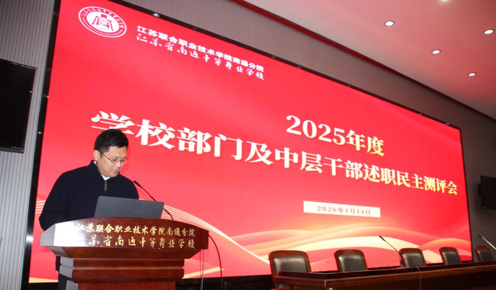 1月14日下午,我校在弘德报告厅召开2025年度学校部门及中层干部述职测评会。校领导班子全体成员及教代会代表出席会议,共同听取述职并进行民主测评。会议由校长万军主持。