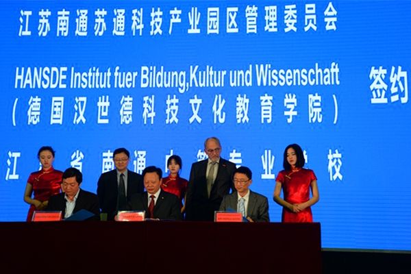 随后,举行南通中专政校企合作系列活动。活动主要包括南通森林广告艺术工程有限公司张晓林先生、南通中专许振华校长签订《校企文化基地建设协议》,江苏联合职业技术学院院长、党委副书记晏仲超先生和著名画家、原南通大学副校长沈启鹏教授为南通中专雕塑艺术馆揭牌,南通苏通科技产业园管理委员会副主任曹海锋、德国汉世德科技文化教育学院董事长曹世涛、南通中专党委书记、副校长陈情共同签订《“中德班”联合培养三方协议》,通州湾示范区管委会副主任曹海滨向南通中专党委副书记葛增敏授予通州湾示范区南通中专培训基地铜牌,江苏金通灵流体机械科技股份有限公司人力资源总监赵蓉、南通中专副校长孙海如共同签订高技能人才德国委培战略合作协议,江苏联通南通客户呼叫中心主任缪跃安、赫尔思曼汽车技术(南通)有限公司生产总监姚钱桦分别与南通中专副校长吴晓进签署现代学徒制合作协议,中国纺织服装教育学会副会长、南通中专校长许振华分别向南通光明服装有限公司和江苏唯路易实业有限公司颁发 “中国纺织服装人才培养基地”铜牌和南通中专高职生毕业设计服饰展演等。