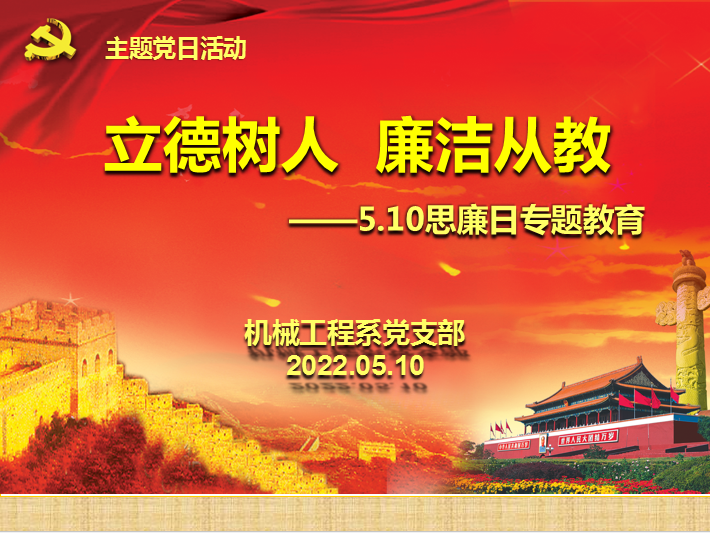 5月10日,机械工程系党支部组织开展了以“立德树人,廉洁从教”为主题的“5.10”思廉日专题教育活动。支部书记严海军主持,支部全体党员参加。