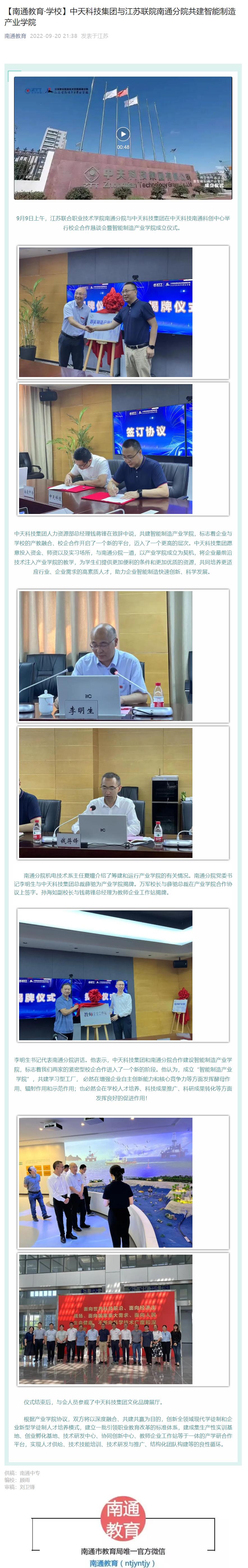 新闻资讯 当前位置: 首页 > 新闻资讯 > 媒体聚焦 > 正文 【南通教育】中天科技集团与江苏联院南通分院共建智能制造产业学院 浏览量:时间:2022-09-21 来源:南通教育 原文链接:https://mp.weixin.qq.com/s?__biz=MzA3MDI4NzczMg==&mid=2651502237&idx=3&sn=39ef28cd41c4e5835914e6ab6ced9a79&chksm=84c13e86b3b6b790335a24596e04e766eb12e96f187f807e7dd415876a14eb62ef4eca74d0d0&mpshare=1&scene=23&srcid=0921yhUjCXc0UbJfu5pIkmPe&sharer_sharetime=1663719765596&sharer_shareid=398ed0daaa55bf8491c87f050de3b598#rd 分享到: