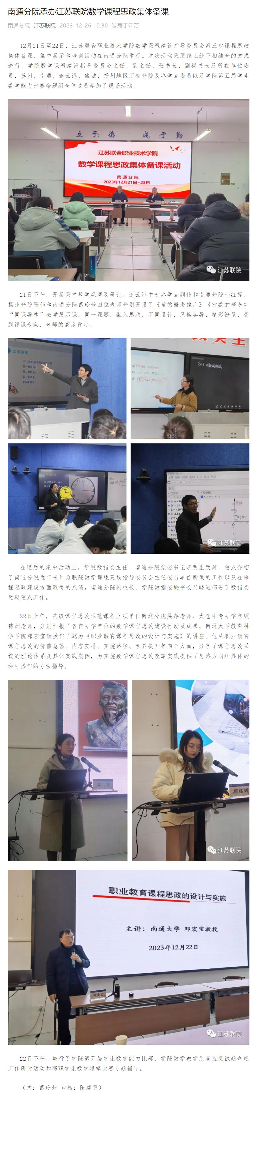 新闻资讯 当前位置: 首页 > 新闻资讯 > 媒体聚焦 > 正文 【江苏联院】南通分院承办江苏联院数学课程思政集体备课 浏览量:时间:2023-12-30 来源:江苏联院 原文链接:https://mp.weixin.qq.com/s/2hGl5QSa0aR1ikxFbwN4RQ 分享到:
