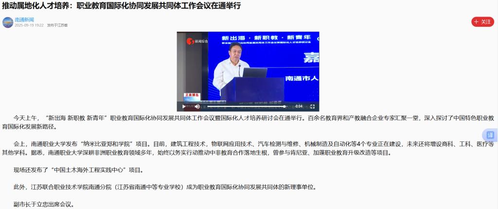 新闻资讯 当前位置: 首页 > 新闻资讯 > 媒体聚焦 > 正文 【南通电视台】推动属地化人才培养:职业教育国际化协同发展共同体工作会议在通举行 浏览量:时间:2025-09-22 来源:南通电视台 原文链接:https://web.ntjoy.com/h5app/a/2509/3ab7d3503b044887b9a70d772e2671cf.html?isshare=1 分享到: