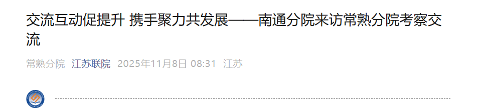 新闻资讯 当前位置: 首页 > 新闻资讯 > 媒体聚焦 > 正文 【江苏联院】交流互动促提升 携手聚力共发展——南通分院来访常熟分院考察交流 浏览量:时间:2025-11-10 来源:江苏联院 原文链接:https://mp.weixin.qq.com/s?__biz=Mzg3NjkwNzY5MQ==&mid=2247496395&idx=1&sn=06387b4f257d1951b05c2d23c27d95a7&chksm=cea71c519db81ea5332fa46a1a9f4c66374b244c0c009eab57ce678d1720d3da7158dc5f5f8b&mpshare=1&scene=23&srcid=1108vUuvqpmssilolsWsY6CT&sharer_shareinfo=6a4329594926130926b02a71be38684d&sharer_shareinfo_first=8c8e796f527d41ac22d4807684314ca7#rd 分享到: