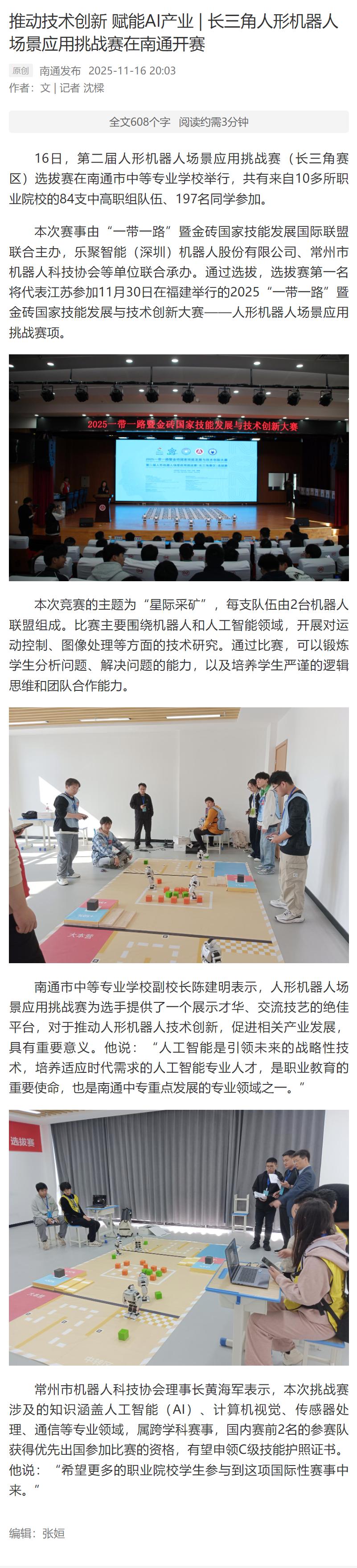 新闻资讯 当前位置: 首页 > 新闻资讯 > 媒体聚焦 > 正文 【南通发布】推动技术创新 赋能AI产业 | 长三角人形机器人场景应用挑战赛在南通开赛 浏览量:时间:2025-11-18 来源:南通发布 原文链接:https://nginx-ntfb.ntfabu.com/ntfb/site1/mweb/ja0fc/content_36775929.html 分享到: