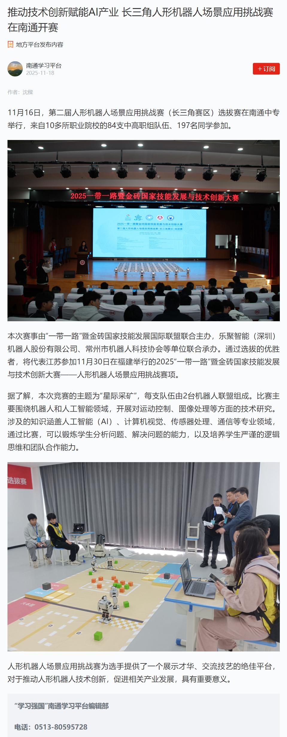 新闻资讯 当前位置: 首页 > 新闻资讯 > 媒体聚焦 > 正文 【南通学习平台】推动技术创新赋能AI产业 长三角人形机器人场景应用挑战赛在南通开赛 浏览量:时间:2025-11-20 来源:南通学习平台 原文链接:https://article.xuexi.cn/articles/index.html?art_id=13434417972884494306&cdn=https%3A%2F%2Fregion-jiangsu-resource&item_id=13434417972884494306&study_style_id=feeds_opaque&t=1763451520628&showmenu=false&ref_read_id=b348a4ed-01ba-443d-b9b6-9f5b88145200&pid=&ptype=-1&source=share&share_to=wx_single 分享到: