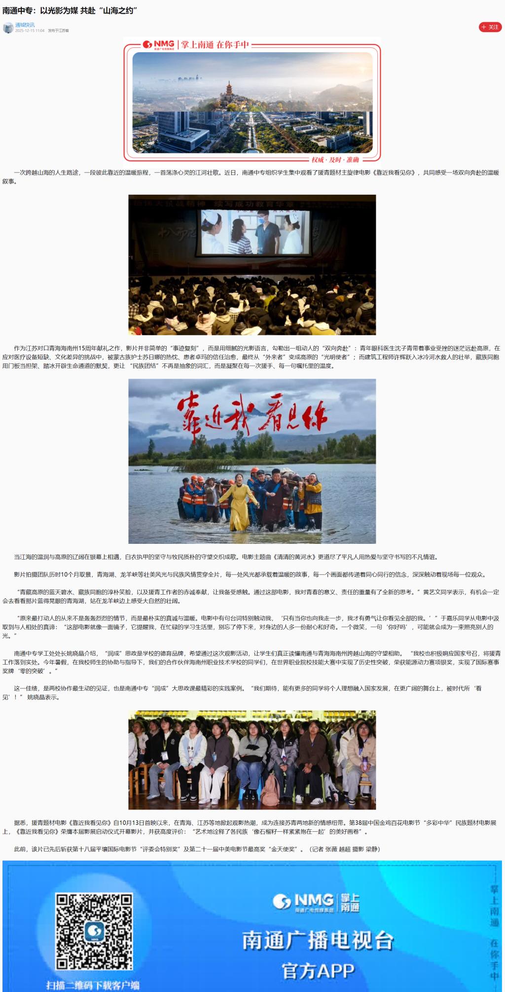 新闻资讯 当前位置: 首页 > 新闻资讯 > 媒体聚焦 > 正文 【掌上南通】南通中专:以光影为媒 共赴“山海之约” 浏览量:时间:2025-12-16 来源:掌上南通 原文链接:https://web.ntjoy.com/h5app/a/2512/3ae3530170f24e3a90df3e7f43a7b3f2.html?isshare=1 分享到:
