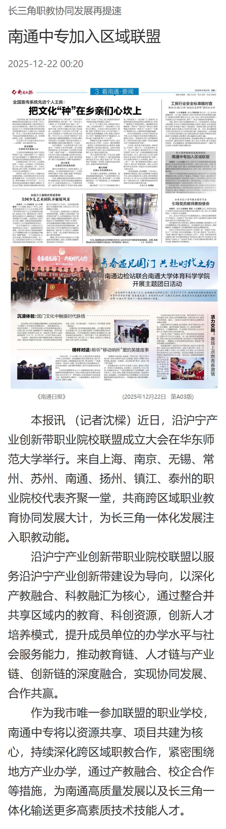 新闻资讯 当前位置: 首页 > 新闻资讯 > 媒体聚焦 > 正文 【南通日报】长三角职教协同发展再提速 南通中专加入区域联盟 浏览量:时间:2025-12-22 来源:江海晚报 原文链接:https://nginx-ntfb.ntfabu.com/ntfb/site1/m/c7/a37239.html?paperId=1&paperType=0&colId=7 分享到: