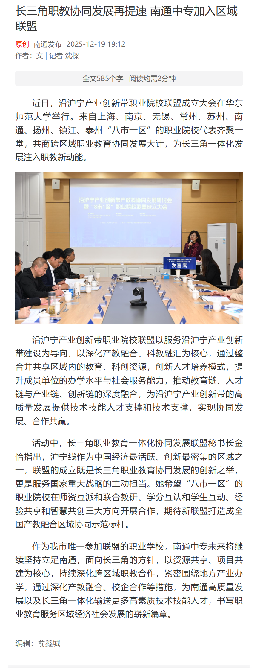 新闻资讯 当前位置: 首页 > 新闻资讯 > 媒体聚焦 > 正文 【南通发布】长三角职教协同发展再提速 南通中专加入区域联盟 浏览量:时间:2025-12-22 来源:南通发布 原文链接:https://nginx-ntfb.ntfabu.com/ntfb/site1/mweb/ja0ij/content_36783697.html 分享到: